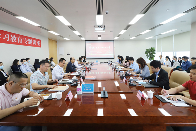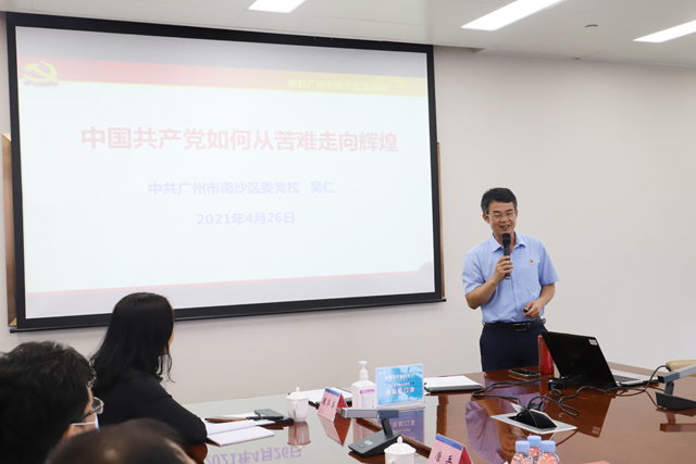 为深入开展党史学习教育,从党的百年伟大奋斗历程中汲取继续前进的智慧和力量,助力企业发展,4月26日,九游(中国)控股集团举办党史学习教育专题讲座。特邀南沙区委党校常务副校长吴仁作专题讲座。南沙区工商联副主席、区“两新”党工委副书记、区非公党委副书记贺雪明,南沙区总商会副秘书长兼区非公党委党建指导员林潮伟,集团董事长赖宁昌,集团总裁王霄雄出席会议,集团党委委员、纪委委员、支部书记和党员代表,以及在集团总部上班的经理级别以上管理人员共60多人聆听了讲座。会议由集团党委书记钟奇偶主持。
